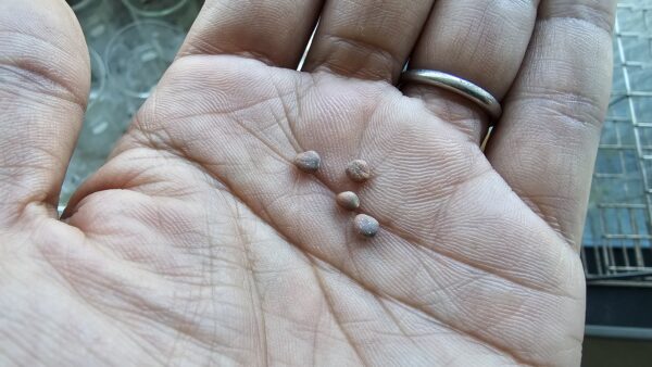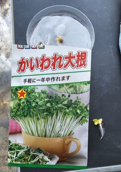 こちらがかいわれ大根の種子。乾いた状態では、ここから本当に芽が出るのかなと思うほど小さいです。生徒に植物の体が何でできているのか考えさせたいです。