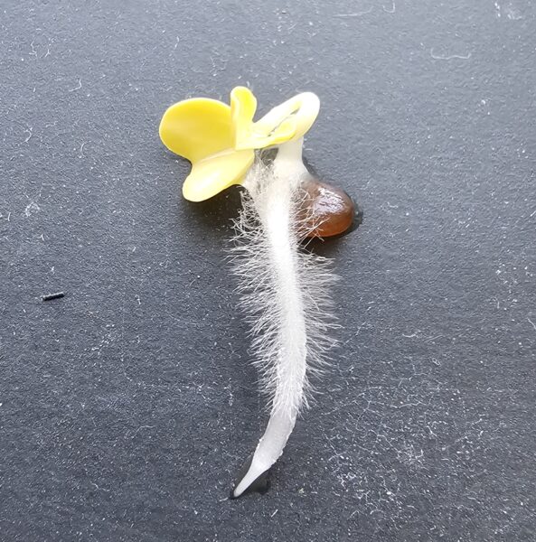 いちばん見てほしいのが根のまわりに広がる白いふわふわです。根毛がとても観察しやすく出ていて、写真でもはっきりわかるほどでした。教科書の図だけでは伝わりにくい「こんなふうについているんだ」という実感を持たせやすく、根が水を吸収するつくりを考えるきっかけにもできるのではないでしょうか。