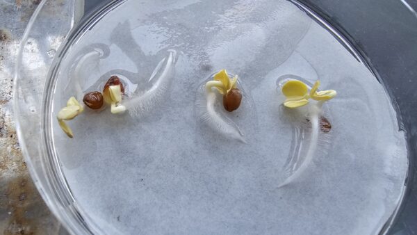 数日経つと、かいわれ大根が発芽します。白い根が伸び、黄色っぽい子葉も見えてきて、植物が育ち始めていることを実感できます。シャーレの中でも十分に変化が見えるので、観察のハードルが低いのもうれしいところです。発芽とあわせて子葉にも注目させると、単子葉類と双子葉類の違いを考える発問にもつなげられそうです。